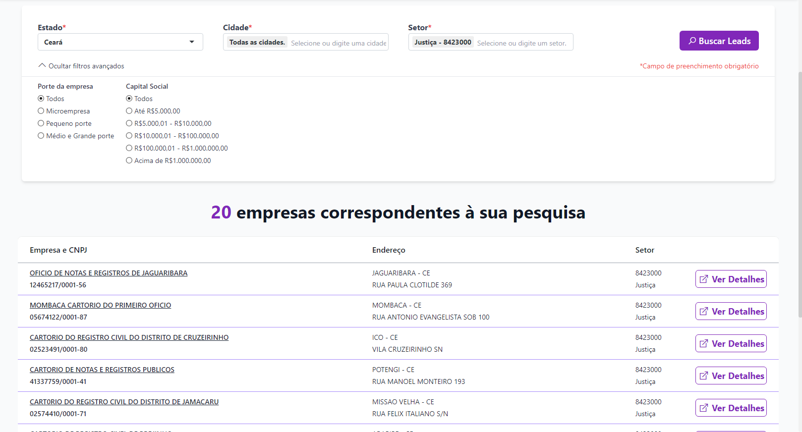 - Filtrando os Leads: Você pode filtrar sua busca por Estado, Cidade, Setor (CNAE), Porte da empresa, e Capital Social. Essa filtragem permite que você refine sua busca, focando exatamente no tipo de lead que mais interessa ao seu negócio.