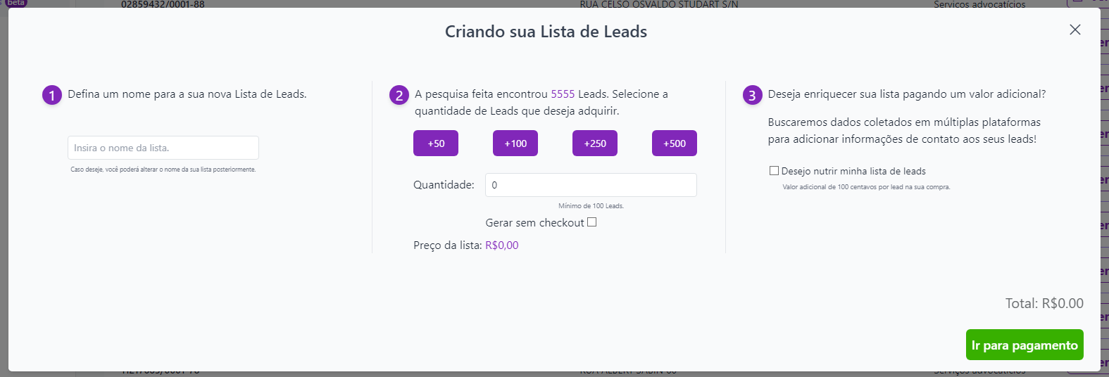 Ao tentar comprar a lista, você poderá personalizá-la escolhendo o nome e a quantidade de leads que deseja. Na tela de pagamento, surge a opção de enriquecer sua lista com informações valiosas adicionais, obtidas de fontes externas à receita federal, sempre respeitando a LGPD.